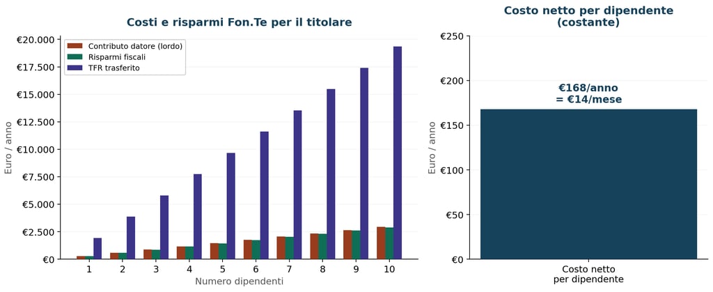 Contributo datoriale: €1.470/anno. Costo netto: €838/anno — €168/dipendente, €14/mese. TFR che esce: €9.674/anno, compensato da circa €1.451/anno di risparmi fiscali.